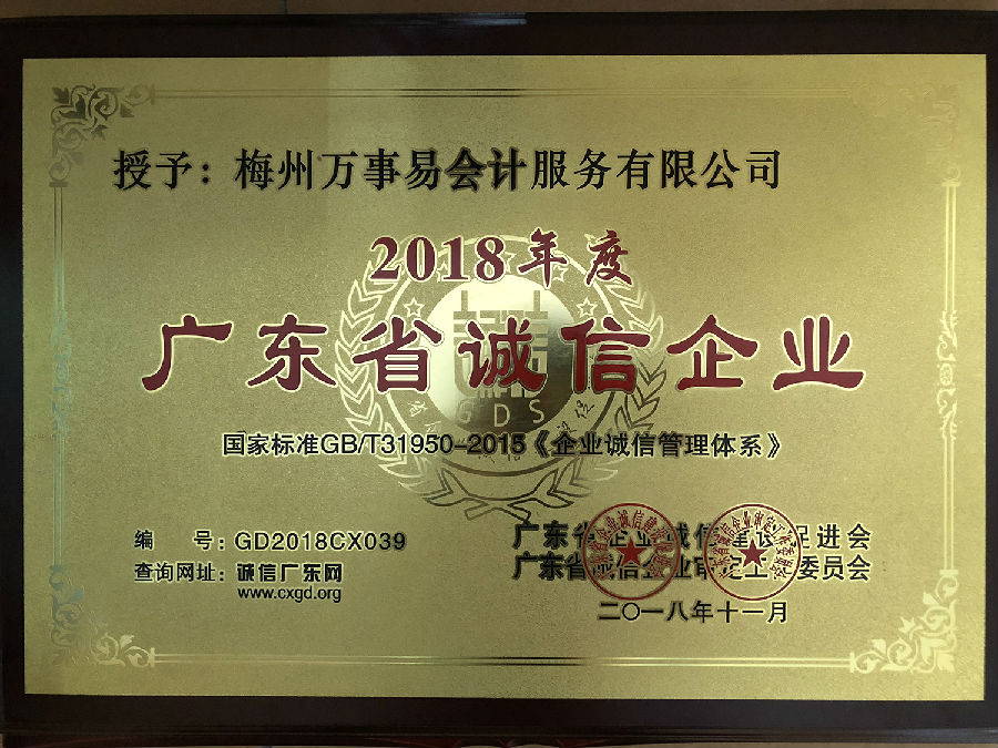 名稱:2018年度廣東省誠信企業(yè)